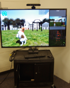 This system was built to study how VR might help kids exercise. It uses activity trackers (Zamzee) to track kids exercise, and allows them to use that exercise to help a virtual pet get better. Through the large-screen kiosk they set goals and play with their pet. By reaching goals, they could teach their pet new tricks.